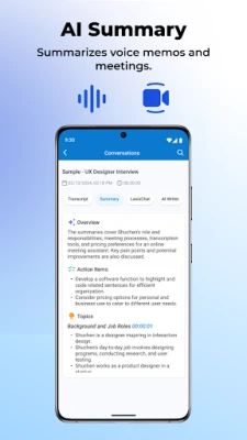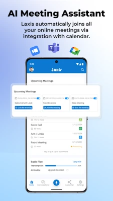 Laxis integreres sømløst med din kalender, og sikrer at den automatisk deltar i alle dine online møter, inkludert Zoom, Google Meet og Teams, for å nøyaktig transkribere og registrere samtalene. For fysiske møter kan du enkelt bruke appen til å ta opp stemmememoer som umiddelbart blir tekst. Kjernen i Laxis' kraft er dens avanserte AI som ikke bare oppsummerer lange diskusjoner til konsise hovedpunkter, men også lar deg stille spørsmål via en chatbot for umiddelbare svar basert på møteinnholdet.