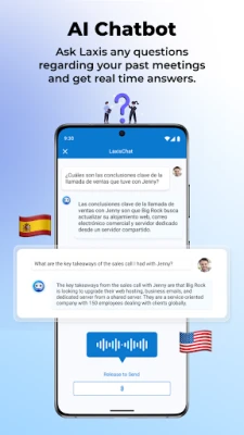 Laxis tar opp og transkriberer møtesamtaler, og genererer automatisk sammendrag, kundekrav, handlingspunkter og oppfølgings-e-poster. Du kan også chatte med Laxis for raske svar basert på tidligere diskusjoner. Øk din produktivitet betydelig før, under og etter møter.