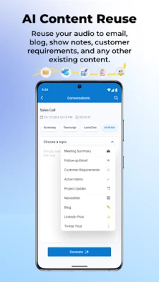 Men Laxis handler om mer enn bare å fange og oppsummere. Appen gir deg en unik mulighet til å gjenbruke møtenes verdi ved å transformere lydopptak til en rekke innholdsformater – enten det er e-poster, blogginnlegg, show notes eller detaljerte kundekrav. Dette effektiviserer arbeidsflyten og forbedrer kvaliteten på ditt utgående materiale. Med et kraftig søkefelt kan du raskt finne spesifikke utsagn eller temaer på tvers av alle dine samtaler. For en enda dypere innsikt og avansert administrasjon tilbyr Laxis også en webapplikasjon med funksjoner som AI Editor, CRM-integrasjon og teamkanaler, som løfter prosjektstyringen og teamjusteringen til nye høyder.