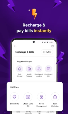 Med PhonePe blir alle dine betalingsbehov dekket, både online og offline. Gjør enkelt betalinger på populære netthandelssteder som Flipkart, Amazon og Myntra, bestill mat fra Zomato og Swiggy, eller planlegg reiser via Makemytrip og Goibibo. For fysiske butikker, bruk den praktiske skann-og-betal-funksjonen via QR-kode for alt fra dagligvarer til medisiner. Appen gjør det også enkelt å lade mobilen og DTH-tjenester, samt å betale regninger for kredittkort, strøm, vann, gass og bredbånd, alt fra ett sentralt sted.